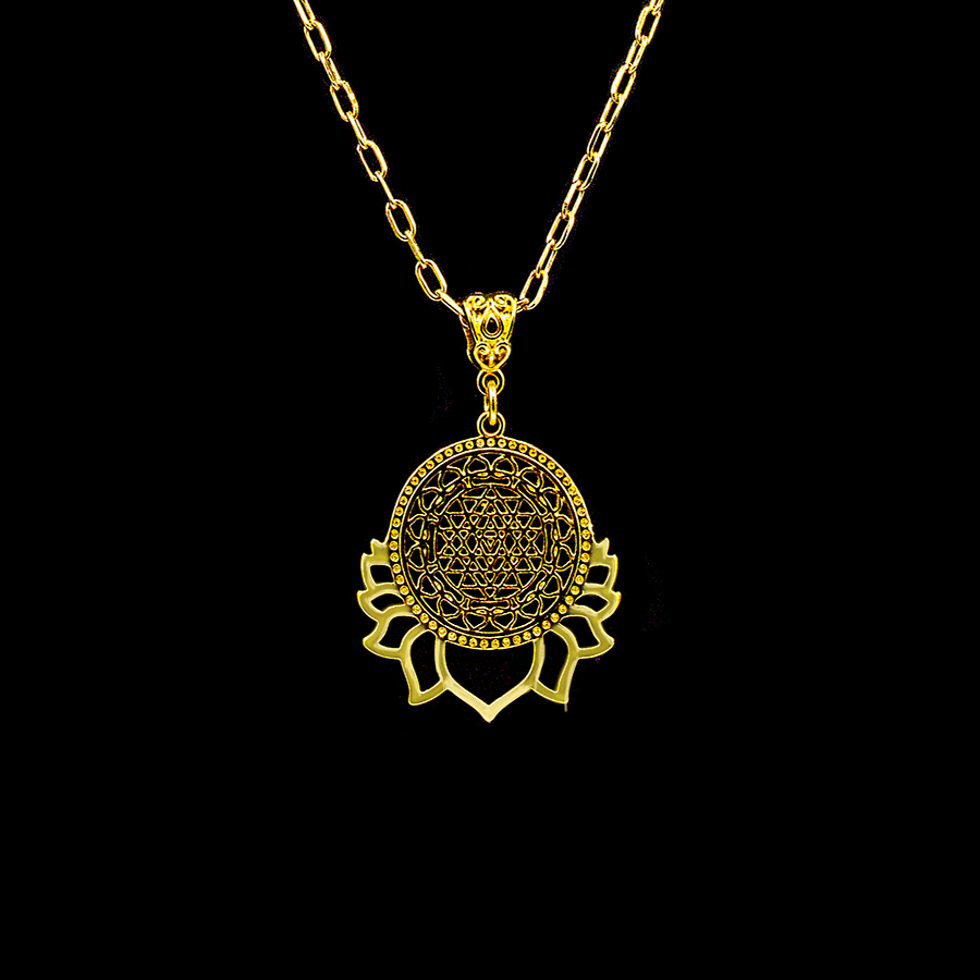 • Sri Yantra: At the heart of the pendant lies the Sri Yantra, celebrated as the “Mother of all Mandalas.” This powerful symbol is a master at manifesting desires, resonating with the Pineal gland and the 3rd Eye Chakra, promoting spiritual awakening and clarity.